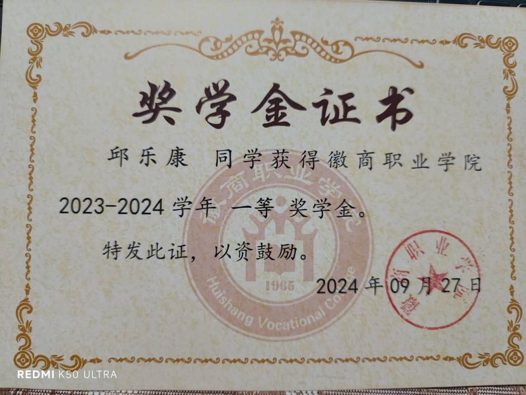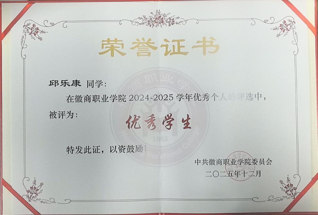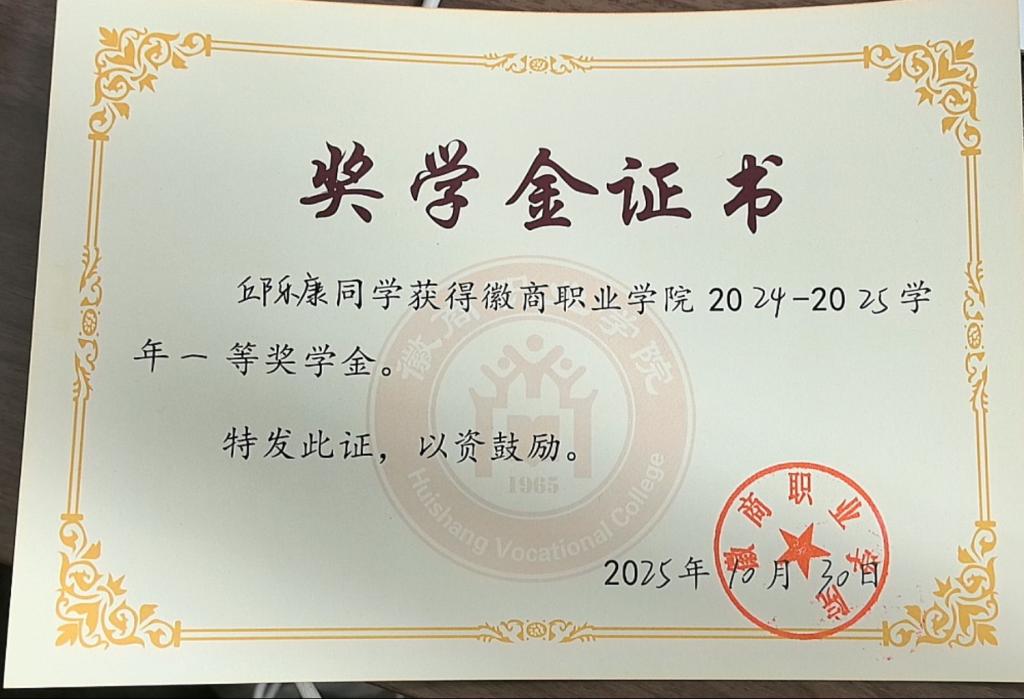 学习上,他将部队的拼搏精神融入软件技术专业学习,从编程语言基础到项目开发实践,始终认真钻研,成绩在班级和专业中名列前茅。凭借优异的学业表现,他先后拿下2023-2024学年、2024-2025学年两届学院一等奖学金,更凭借综合素养斩获2024-2025学年国家励志奖学金。此外,他还主动考取教师资格证,为职业发展拓宽了道路。