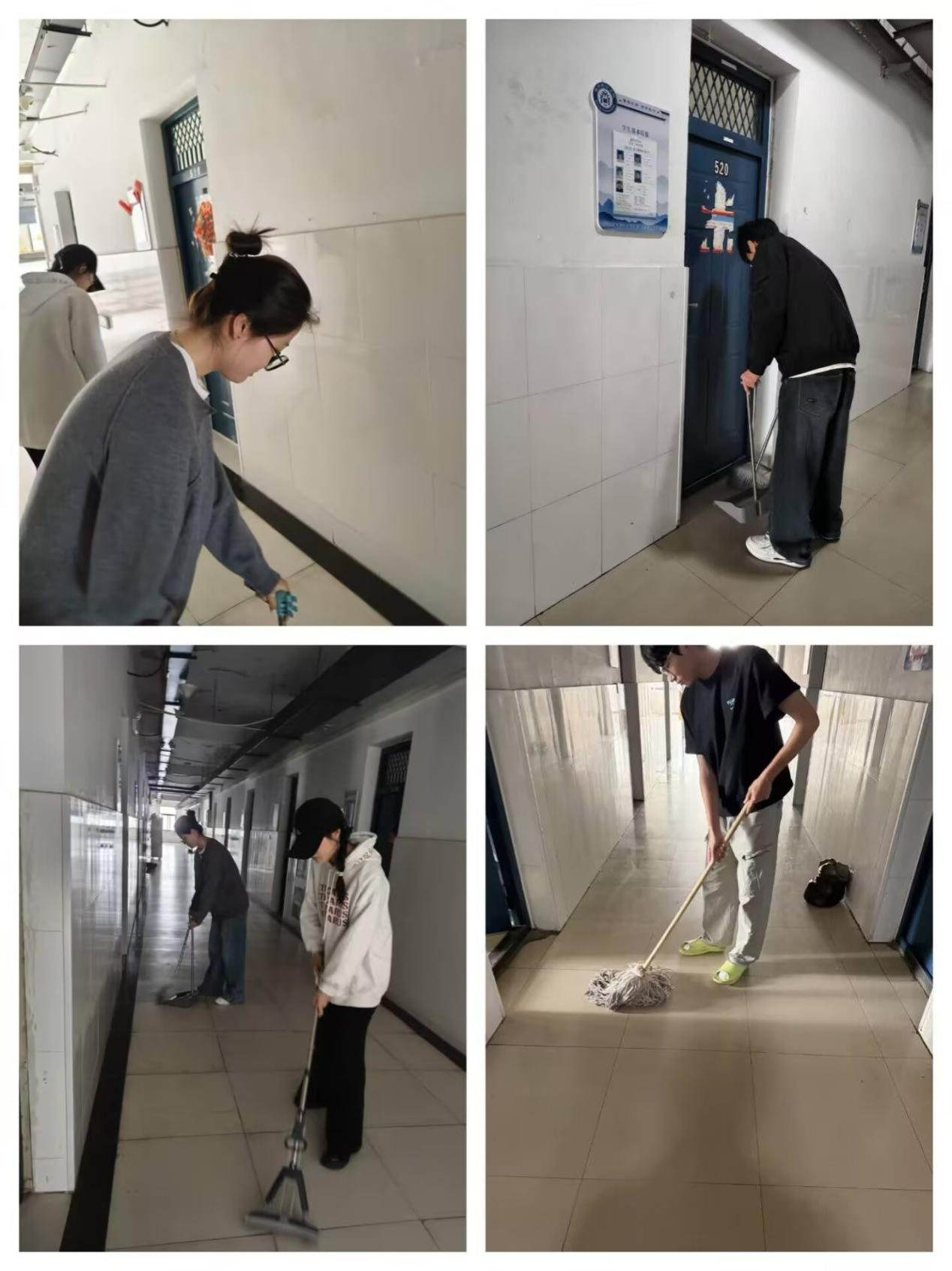活动当天,全体同学准时在指定楼栋集结,手持清洁工具,以饱满的热情投入到志愿清扫中。各小组组长带领组员迅速奔赴负责区域,开启“地毯式”清洁行动:在公共走廊,同学们手持扫帚细致清扫地面垃圾,用拖把反复拖拭地面,彻底清除顽固污渍与灰尘;在楼梯间,大家俯身擦拭扶手、清理台阶缝隙,对墙角积尘、天花板蛛网进行重点清理,不放过任何卫生死角;洗漱台与公共阳台区域,同学们重点清除台面水垢、杂物堆积,让公共区域重拾整洁有序。